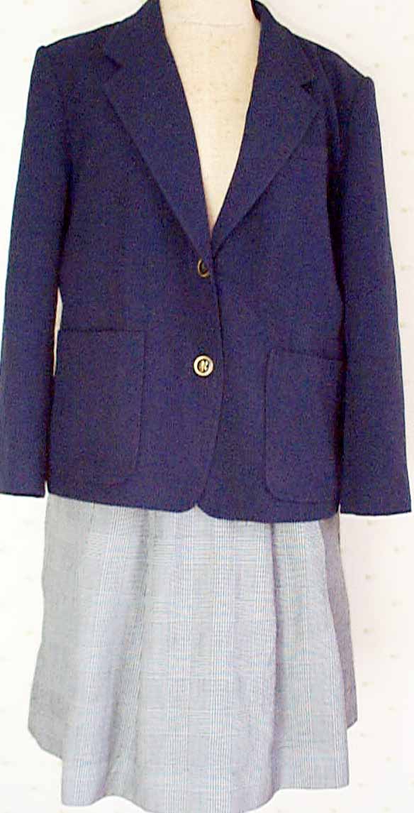 生地紺2個ボタンブレザー。生地白と黒のグレンチェック前広4本後広4本ひだ冬スカート