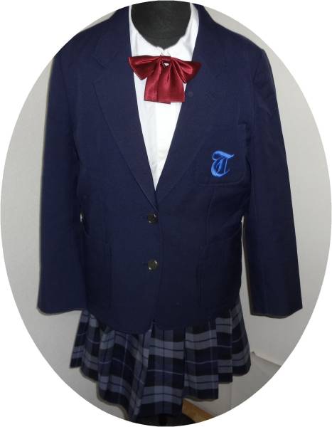 生地紺2個銀ボタンブレザー。生地灰色20本ひだターターンチェックスカート。