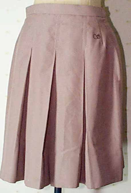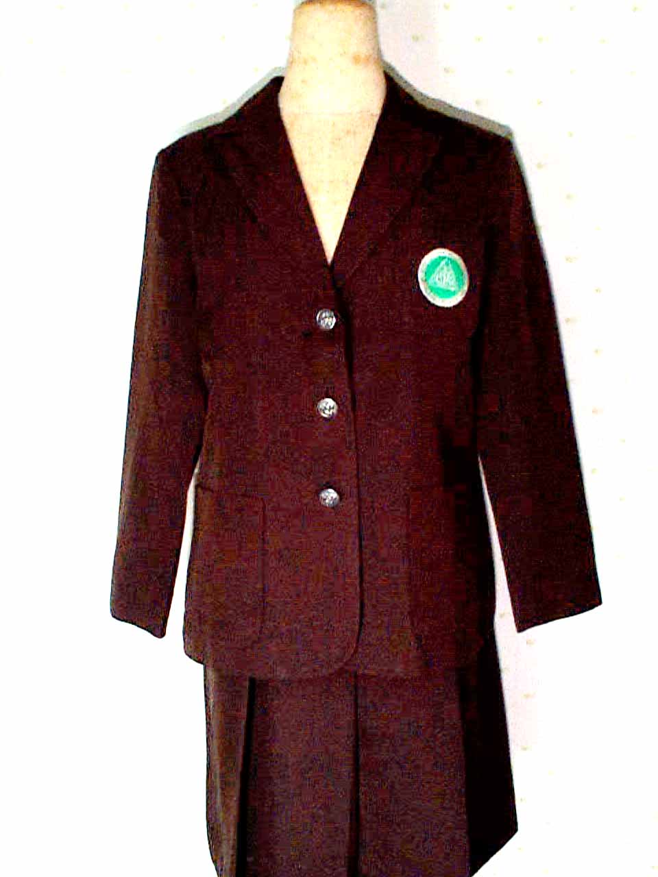 生地こげ茶。校章銀3個ボタンブレザー。ベスト。6本ひだスカート