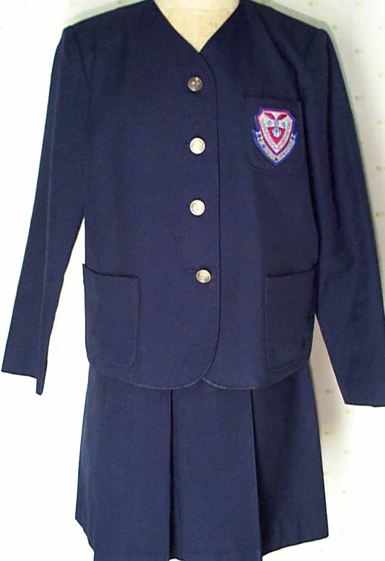 生地紺。3個校章銀ボタンブレザー「ポケットに紺で刺繍有り」。