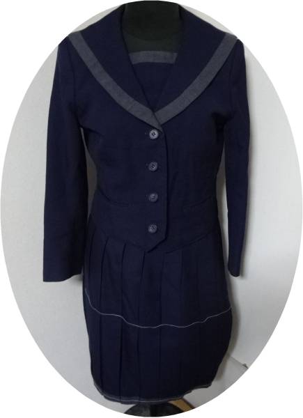 (Dコシノ・ジュンコ)紺4個ボタンセーラー型ブレザー(胸当ての一部とエリのふち灰色)+ 紺20本ひだ冬スカート(裾付近に灰色部分)