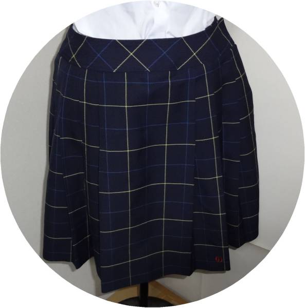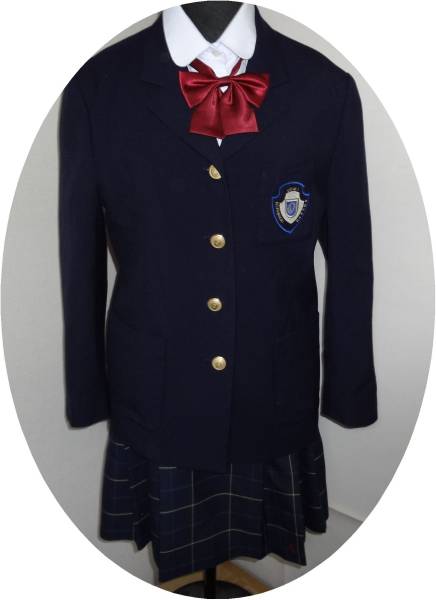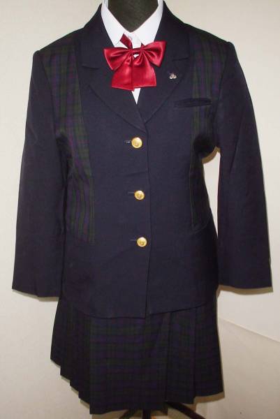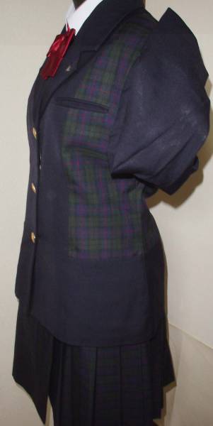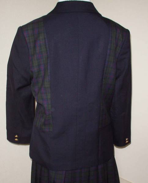 4個ボタン金ブレザー(袖口各2個金ボタン)+前広24本ひだ冬チェックスカート。