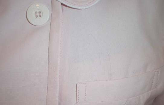 白衣(ピンク色)。中古Lサイズです。 ポケットにマジック汚れ(ピンク・緑)あり。