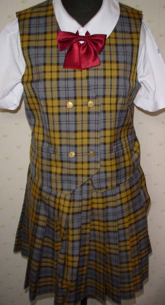 1個ボタン前開きセーラー服です。胸当て校章刺繍あり。エリチェックの夏生地に緑4mmライン