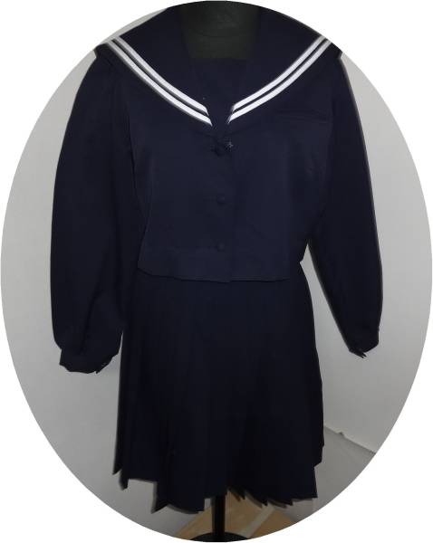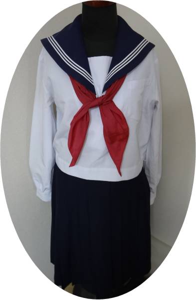 3個ボタン前開きセーラー服。胸当てあり・刺繍付き。前広6本後広6本ひだスカート