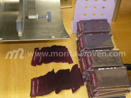カット加工機でテープ状のネームを1枚づつカットし、使用目的によって様々な折り曲げ加工を行います。 |